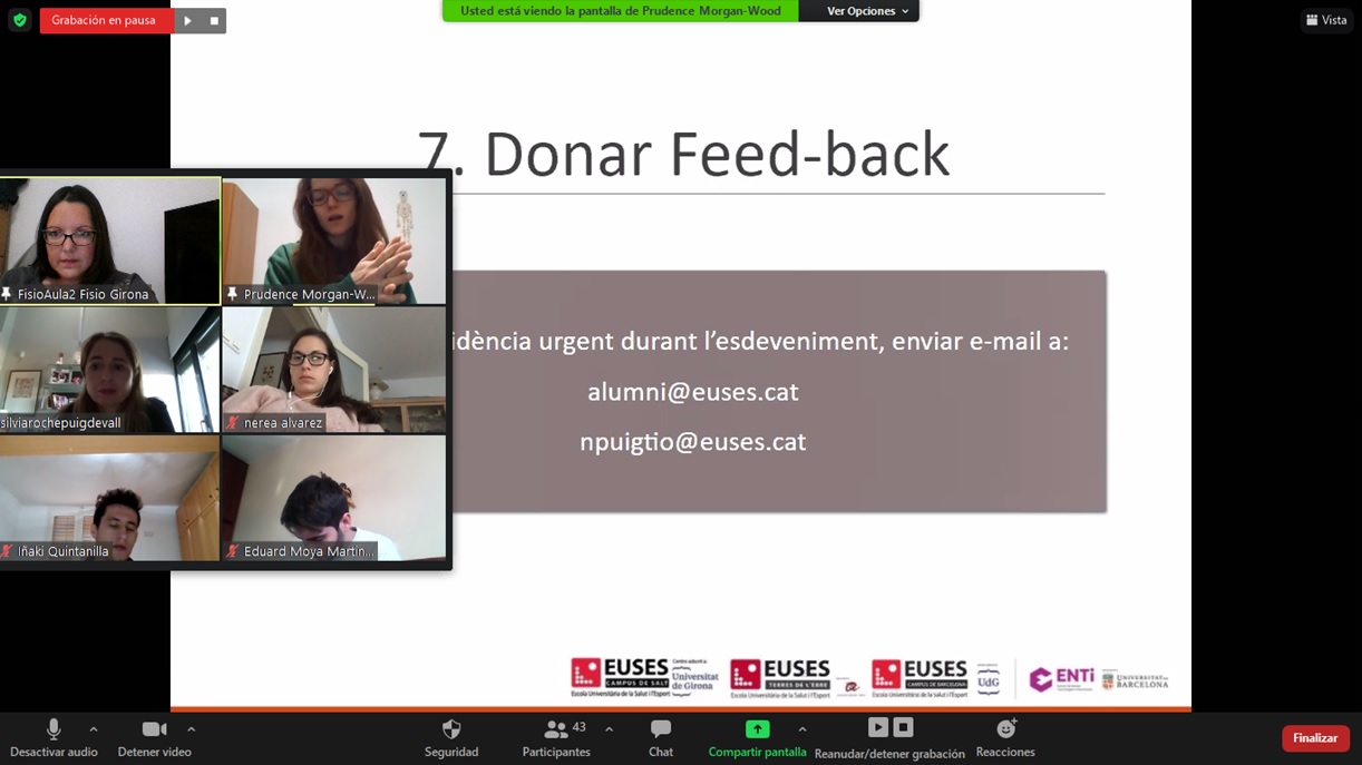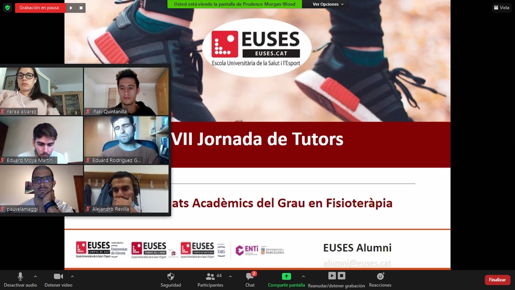 EUSES Alumni, conjuntament amb l’assignatura de Pràcticum del Grau en Fisioteràpia, va organitzar per setè any consecutiu la Jornada de Tutors, que aquesta vegada va tenir format “on line” a causa de la pandèmia del Còvid 19. La formació, que es va realitzar a través de la plataforma Zoom, va comptar amb una quarantena d’assistents entre membres d’Alumni i estudiants de quart curs dels campus de Salt, Bellvitge i Terres de l’Ebre. La xerrada la van impartir responsables d’EUSES Alumni, com la directora Sílvia Roche i Prudence Morgan-Wood; i la professora i coordinadora de Pràcticum, Núria Puigtió. Durant la xerrada es van exposar temes com els detalls necessaris per poder formar part del grup de tutors, el protocol de tractament unificat i les funcions que han d’exercir els tutors en els voluntariats així com altres aspectes més generals relacionats amb Alumni.