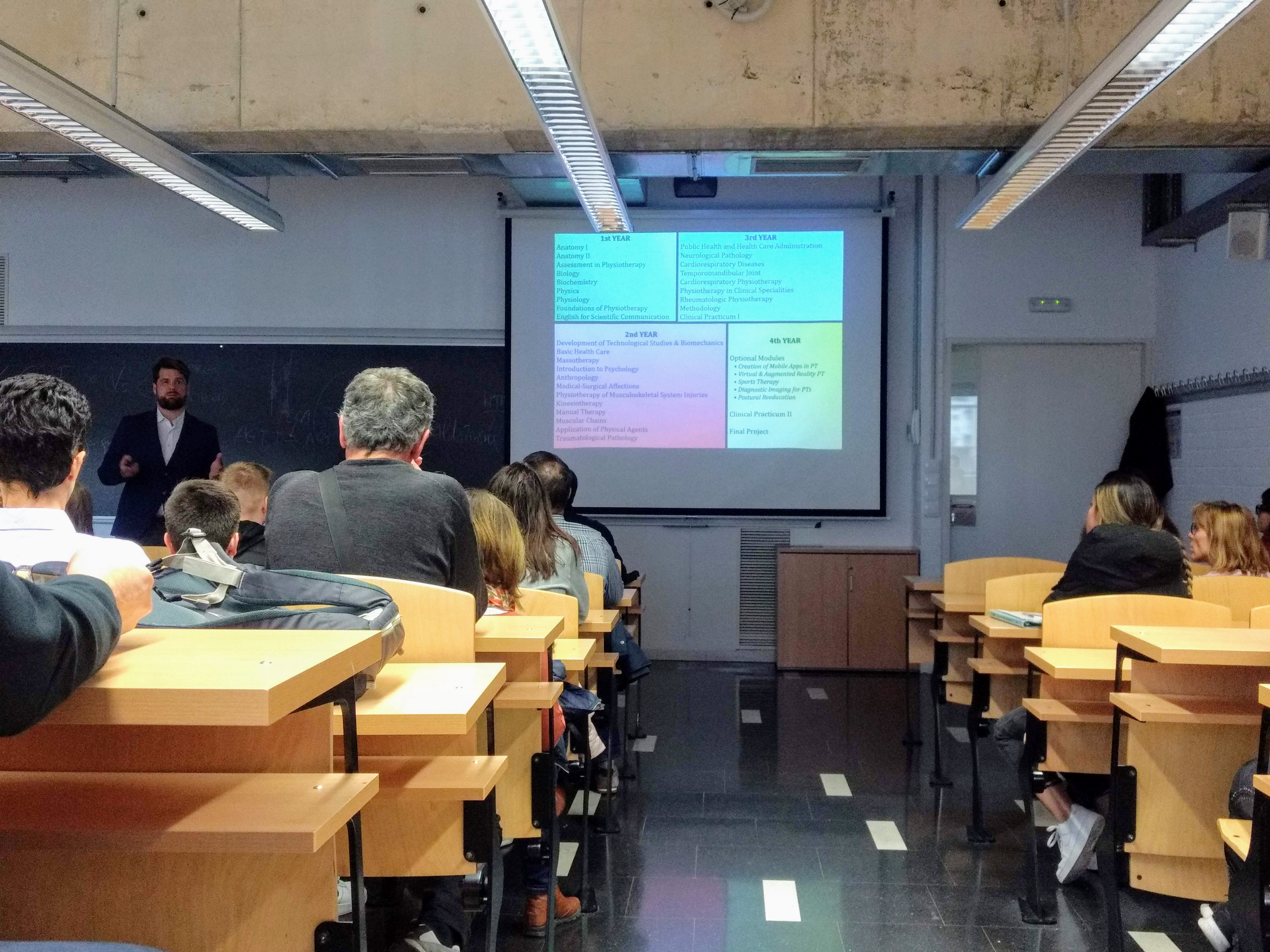 Las puertas del Campus de Bellvitge se han abierto este sábado a los estudiantes que quieren realizar el Grado en Fisioterapia Interuniversitario (UdG-ÚB) a partir del curso académico 2020/21. El director de Physiotherapy, Mariano Gacto, ha dirigido la sesión informativa durante la cual ha detallado de manera exhaustiva todos los aspectos esenciales del grado, como el plan de estudios, las salidas profesionales, los convenios que lo centre universidad tiene firmados, las prácticas en las empresas… Los representantes de EUSES también han resuelto las dudas y han dado respuesta a las preguntas que han formulado a los asistentes, que posteriormente han realizado una visita guiada por estudiantes que están cursando el Grado por las instalaciones del centro universitario. La próxima jornada de puertas abiertas programada en el Campus de Bellvitge es el día 23 de mayo.