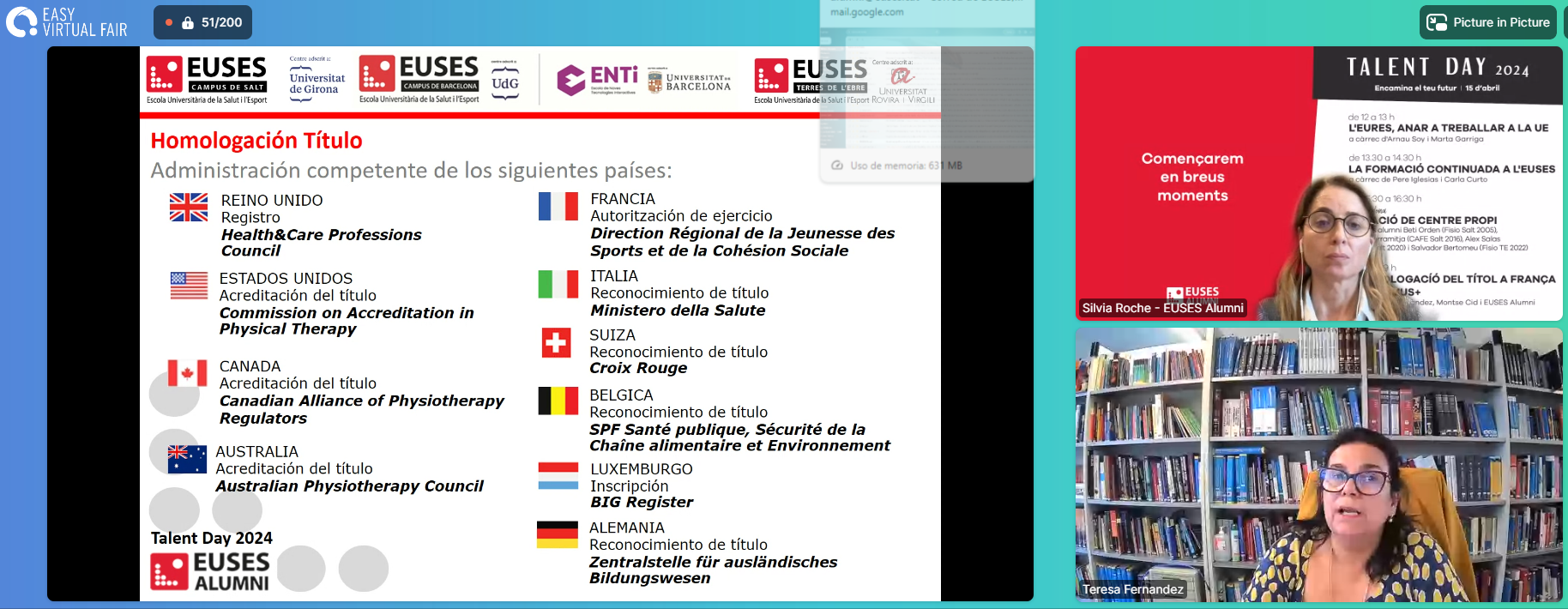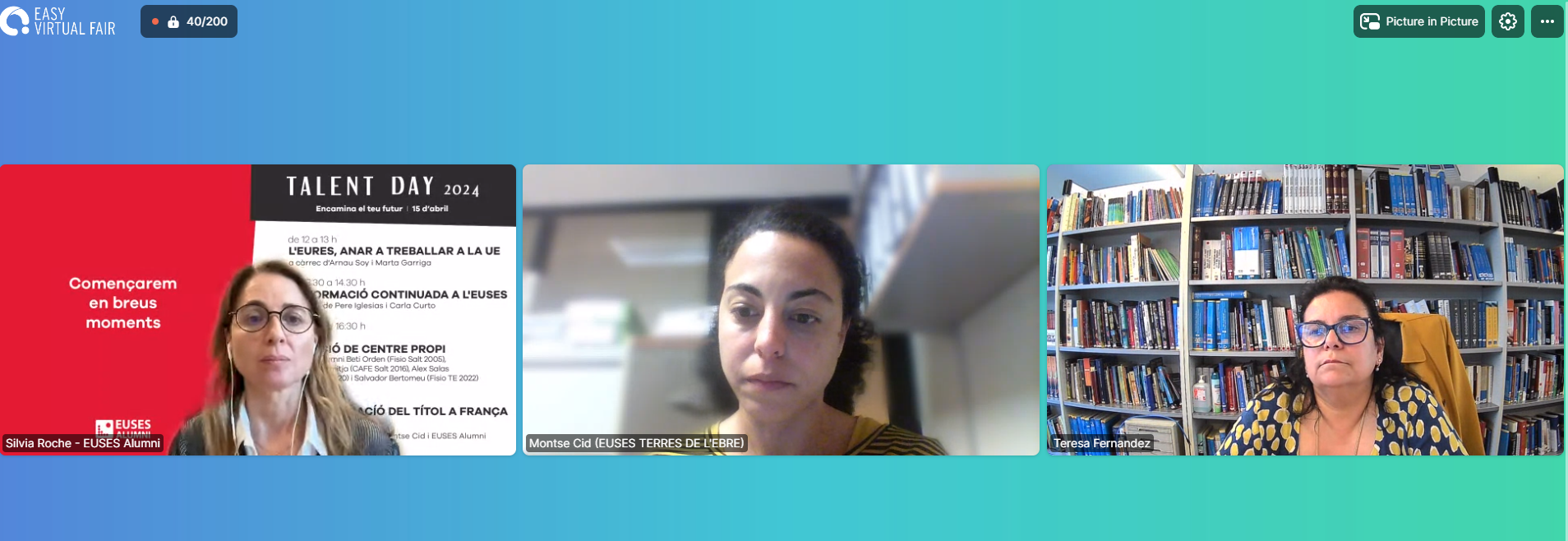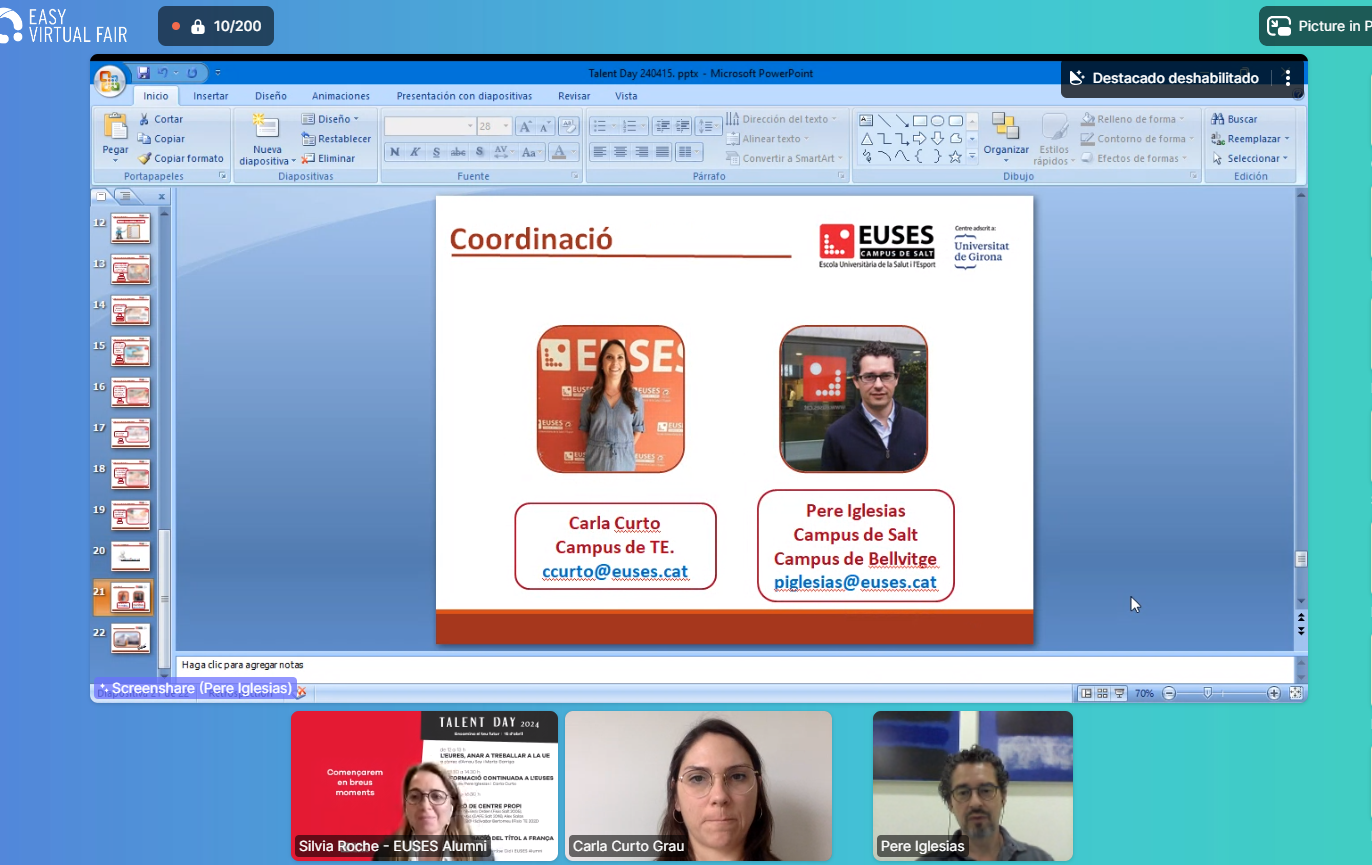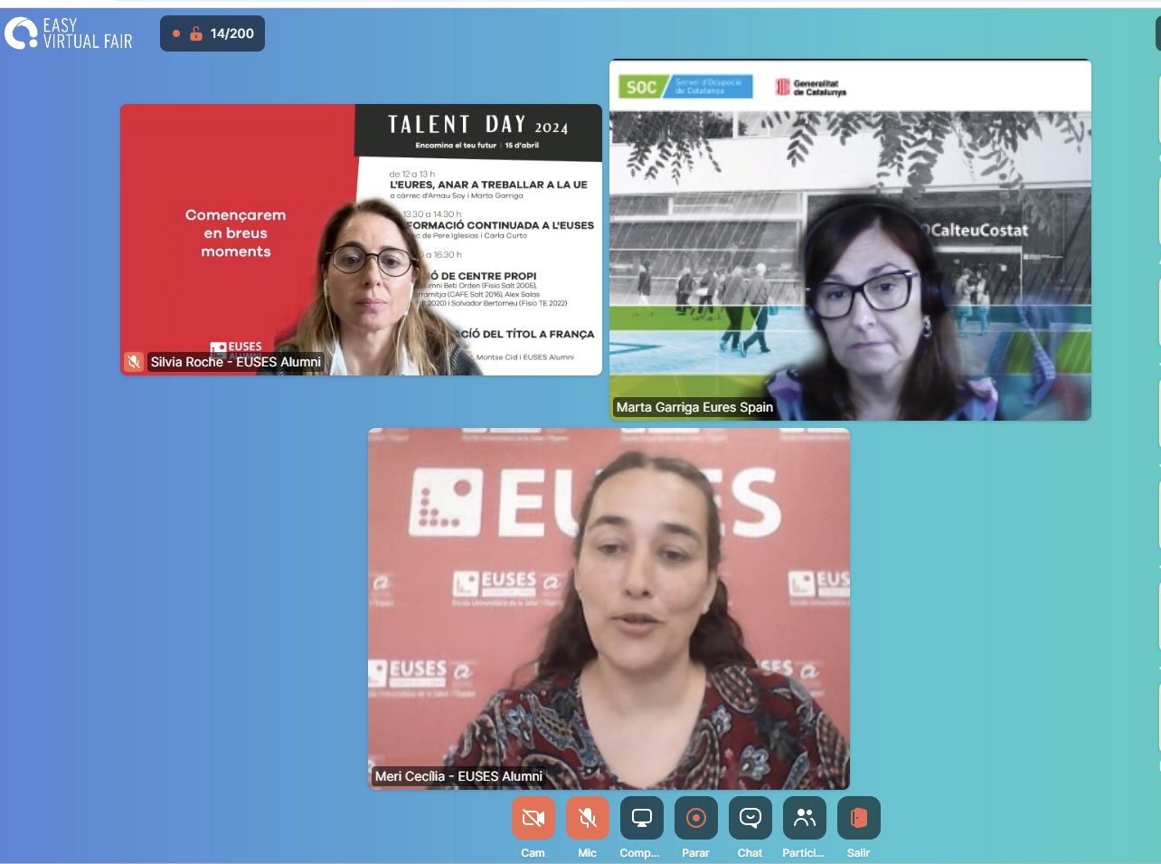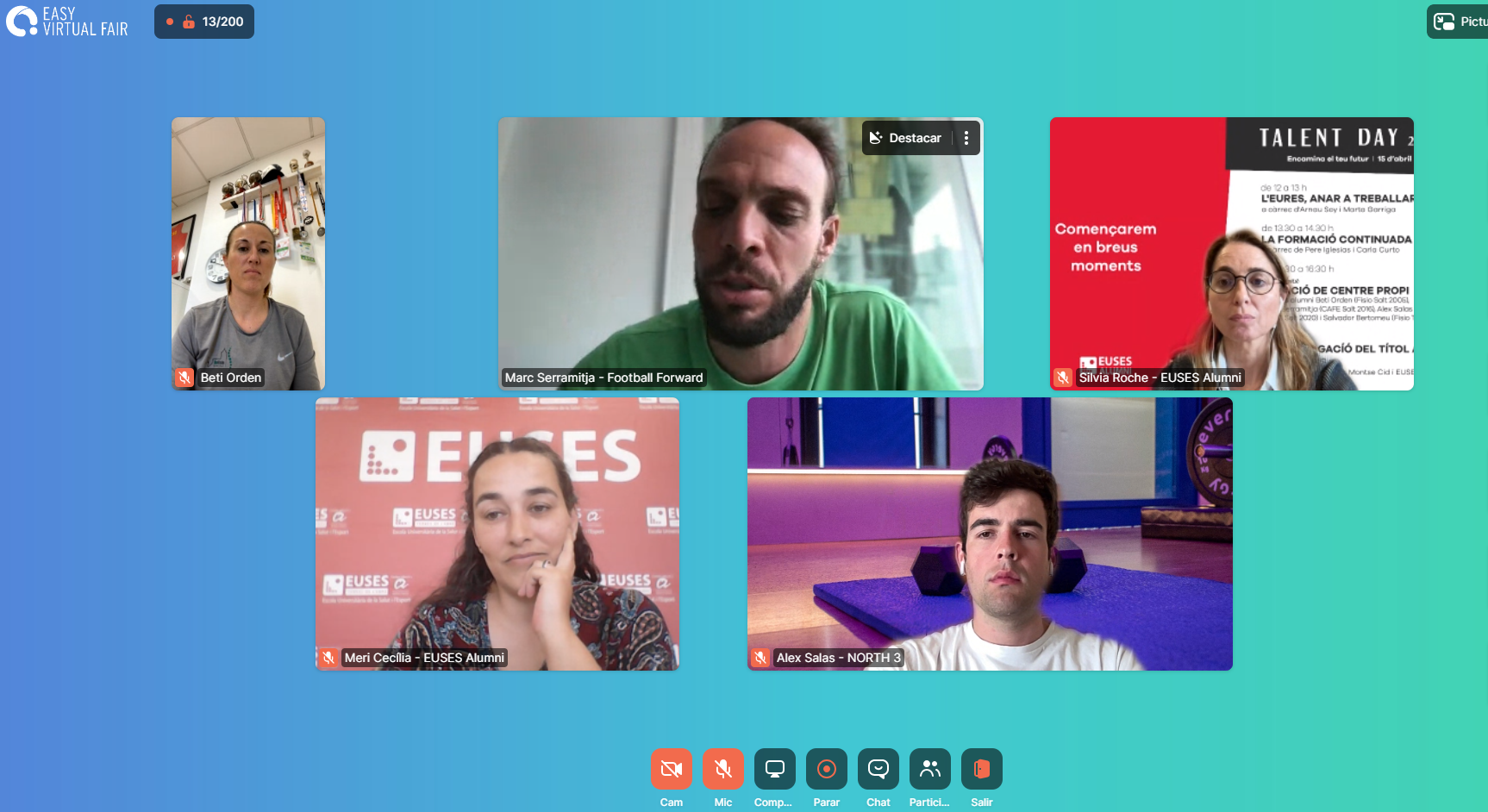 La Feria Virtual de la Ocupación y Orientación Profesional de la Escola Universitària de la Salut i l’Esport puso punto y final a su cuarta edición habiendo logrado todos los objetivos marcados y con unas cifras óptimas de participación. El Talent Day, que ha tenido su centro neurálgico en el Campus de Salt pero que se ha podido seguir virtualmente desde los otros campus del grupo (Terres de l’Ebre y Bellvitge), ha superado los números de las pasadas ediciones y desde la organización, EUSES Alumni, ya se tiene la mirada puesta sobre los nuevos retos a lograr para la próxima edición.