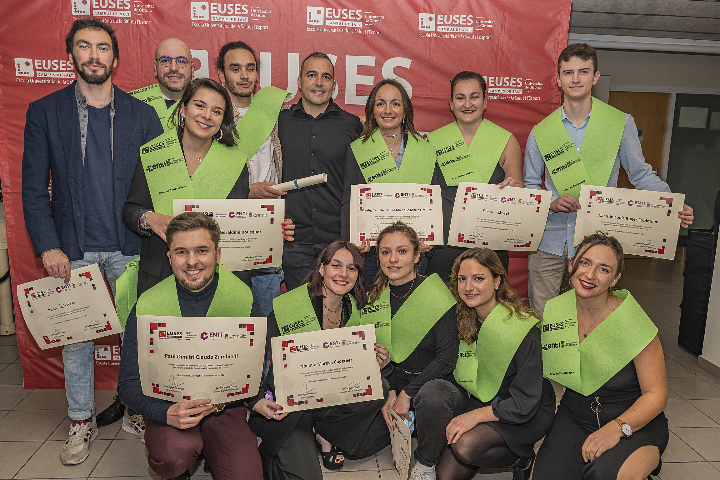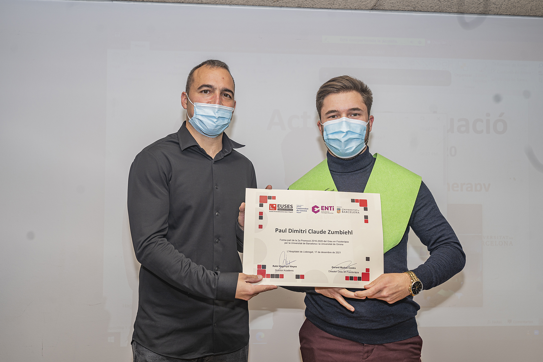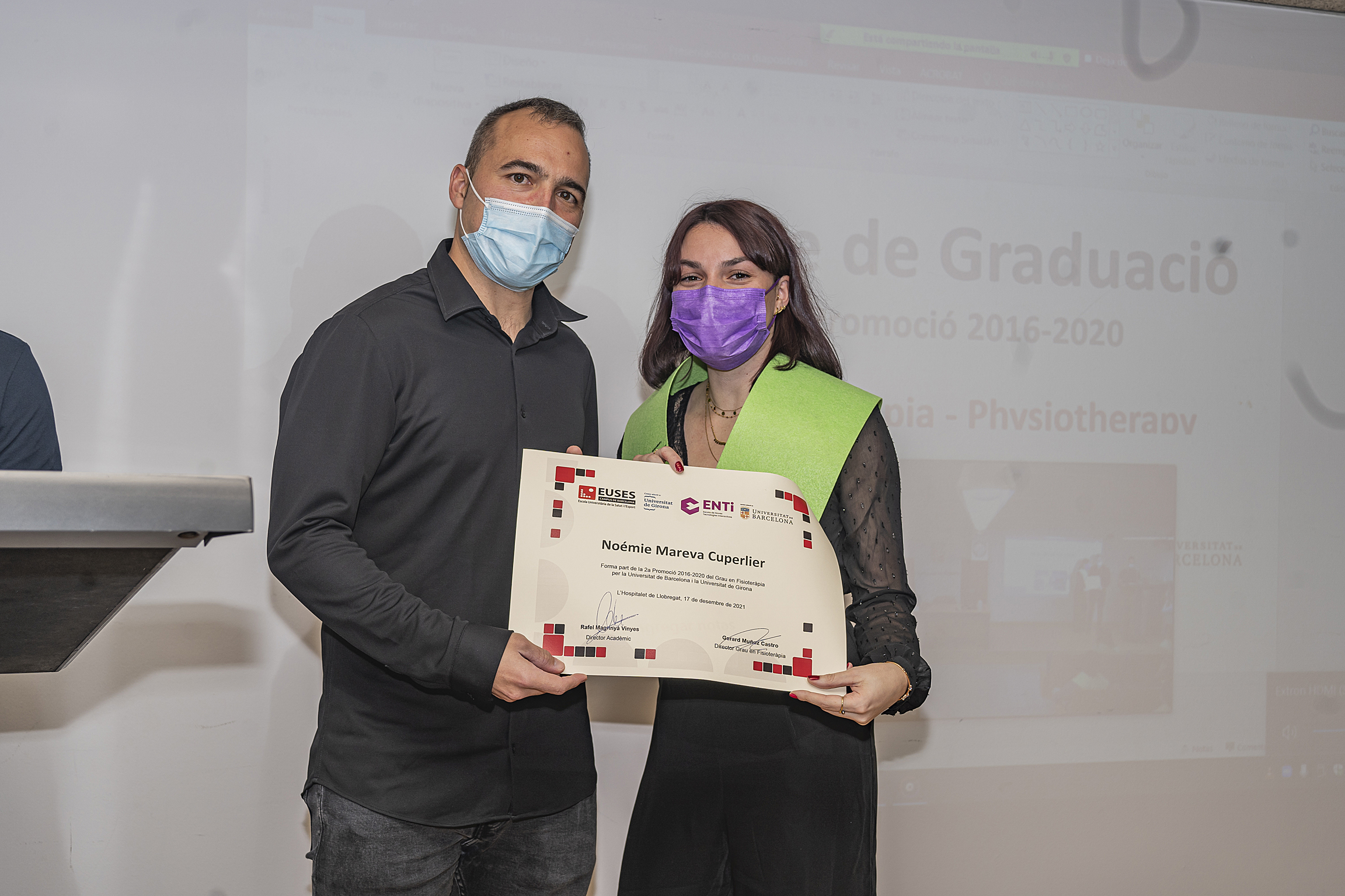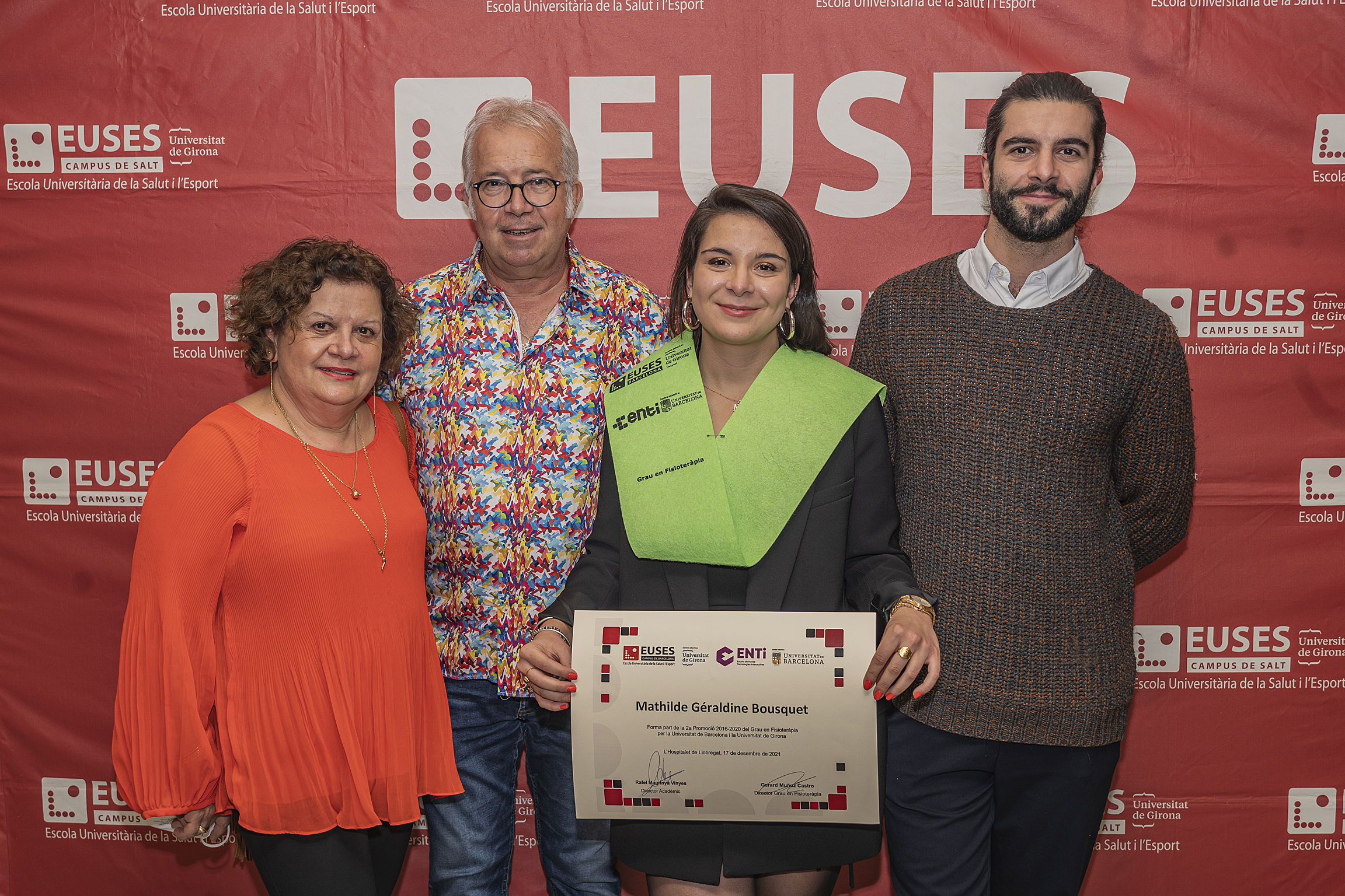 Le dernier vendredi 17 décembre, la cérémonie de remise des diplômes de kinésithérapie (diplôme de l’Université de Gérone et de l’Université de Barcelone) de la promotion 2016/2020, qui avait dû être reportée en raison des restrictions imposées par le Covid-19, s’est tenue dans l’auditorium du Campus de la Santé de Bellvitge. La cérémonie a permis aux diplômés qui ont pu être présents de recevoir leur diplôme en personne après avoir finalisé, il y a deux ans, leur cursus académique au campus de Bellvitge.