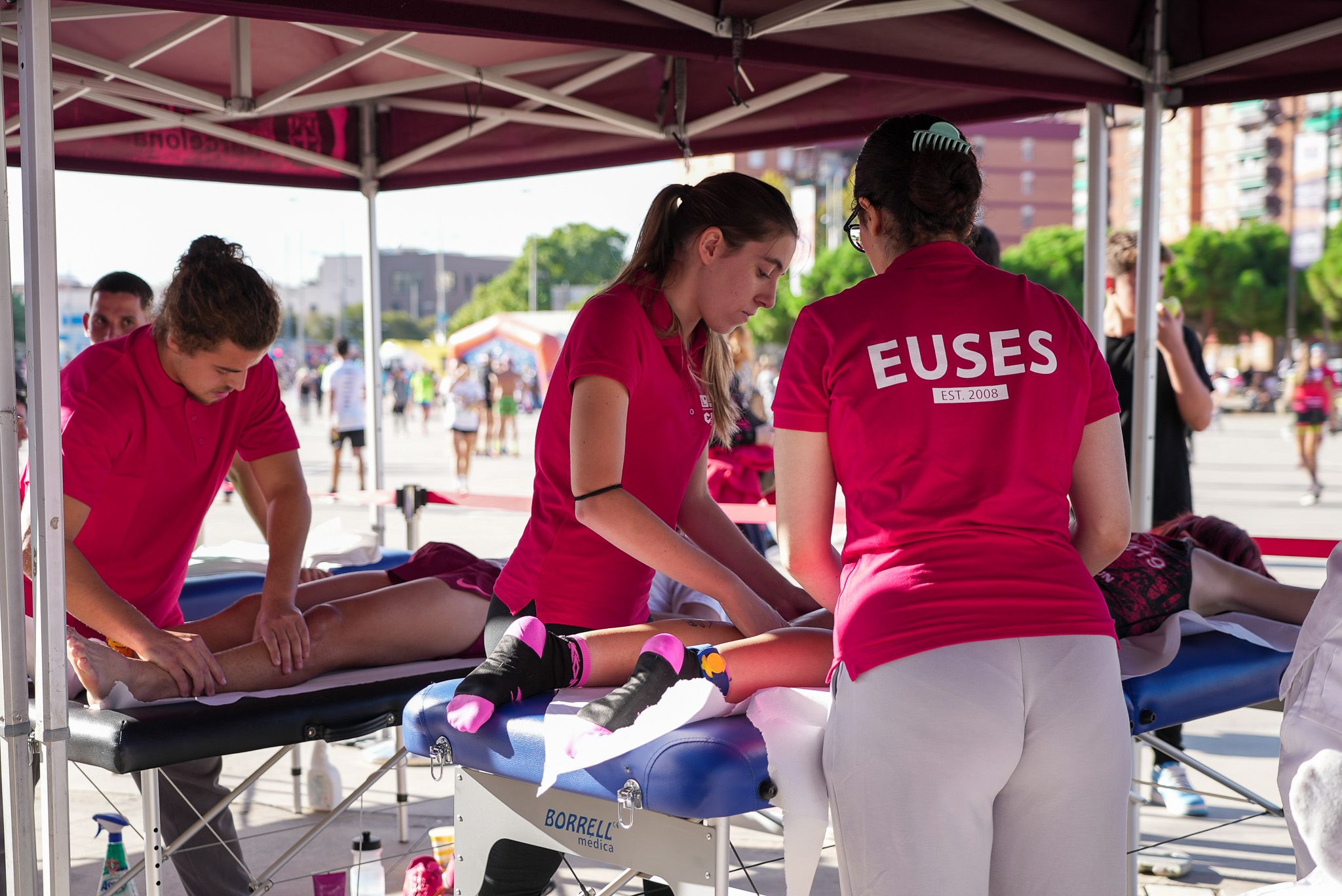 Ce week-end, les étudiants du Campus de Bellvitge ont participé à deux activités de volontariat académique : le Triathlon de Sitges et le Màgic BDN Running. Dans les deux cas, les étudiants ont été placés dans l’aire d’arrivée dans une zone dédiée à la kinésithérapie mis en place pour la récupération des athlètes. Sous la direction des tuteurs et des kinésithérapeutes d’EUSES Alumni (Unai Bengoetxea à Sitges et Alejandro Revilla à Badalona), les étudiants en licence ont effectué des techniques de récupération musculaire (essentiellement des massages et des étirements) pour les participants qui le souhaitaient. À Sitges, les athlètes ont pu choisir entre différentes modalités programmées par 100% Half : triathlon sprint (750 mètres de natation, 20 kilomètres de vélo et 5 kilomètres de course à pied) ; triathlon olympique (distances de 1,5 km, 40 km et 10 km), demi-triathlon (1,9 km, 90 km et 21 km), Aquabike M (1,5 kilomètre de natation et 40 kilomètres de vélo) et Aquabike L (distances de 1,9 km et 90 km). À Badalona, les organisateurs ont conçu une course de 10 km, une course de 5 km et différentes courses pour enfants.