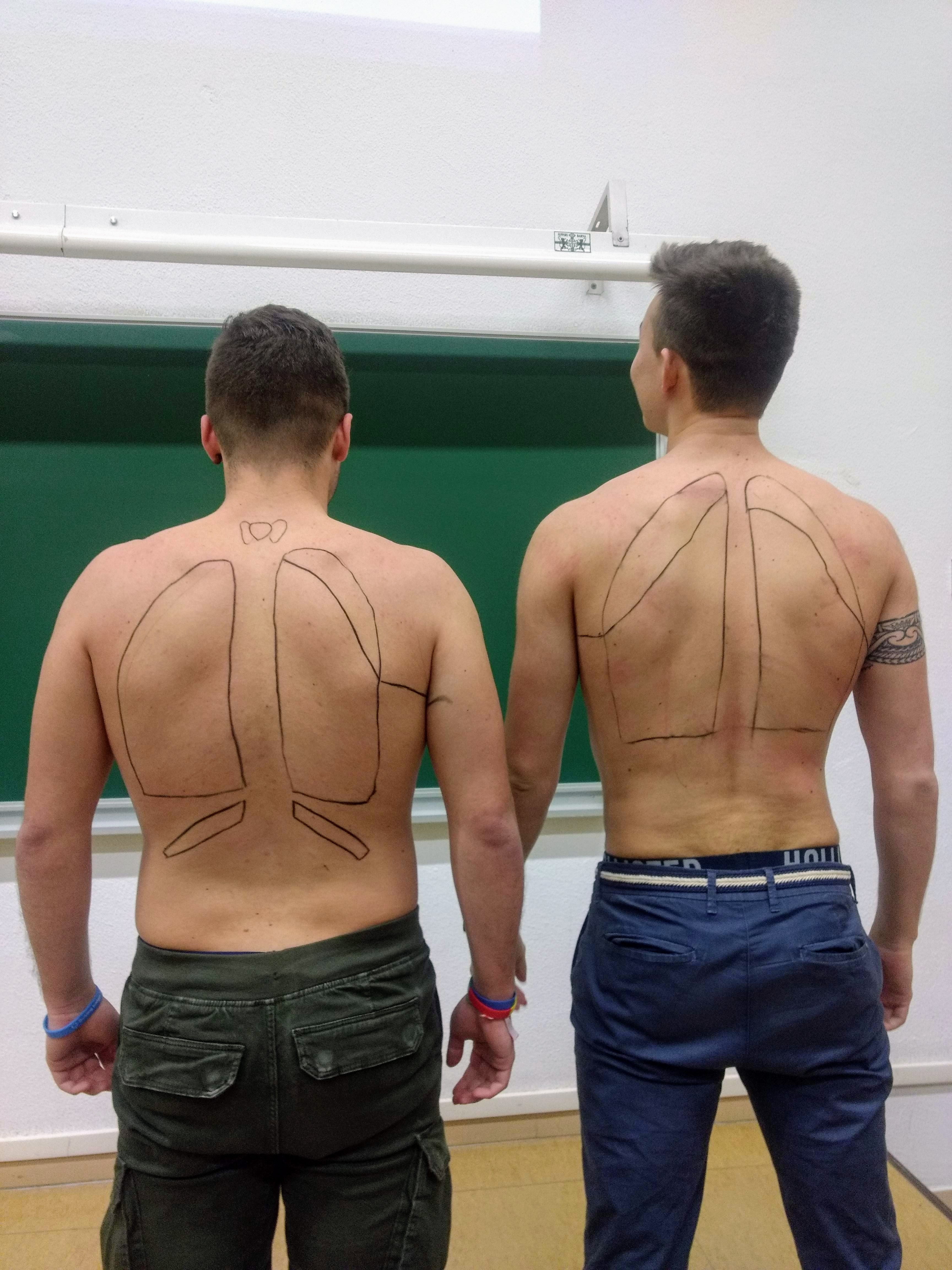The students of the first course have carried out a practical class within the subject of Anatomy taught by Professor Vinicius Rosa. The main objective of the session has been to identify anatomical structures of the cardiovascular and respiratory systems on a dummy and, subsequently, to transfer them to a real body by drawing the contours in the heart and lungs on the skin by palpation of bone structures. In this way, students become familiar with their actual location.